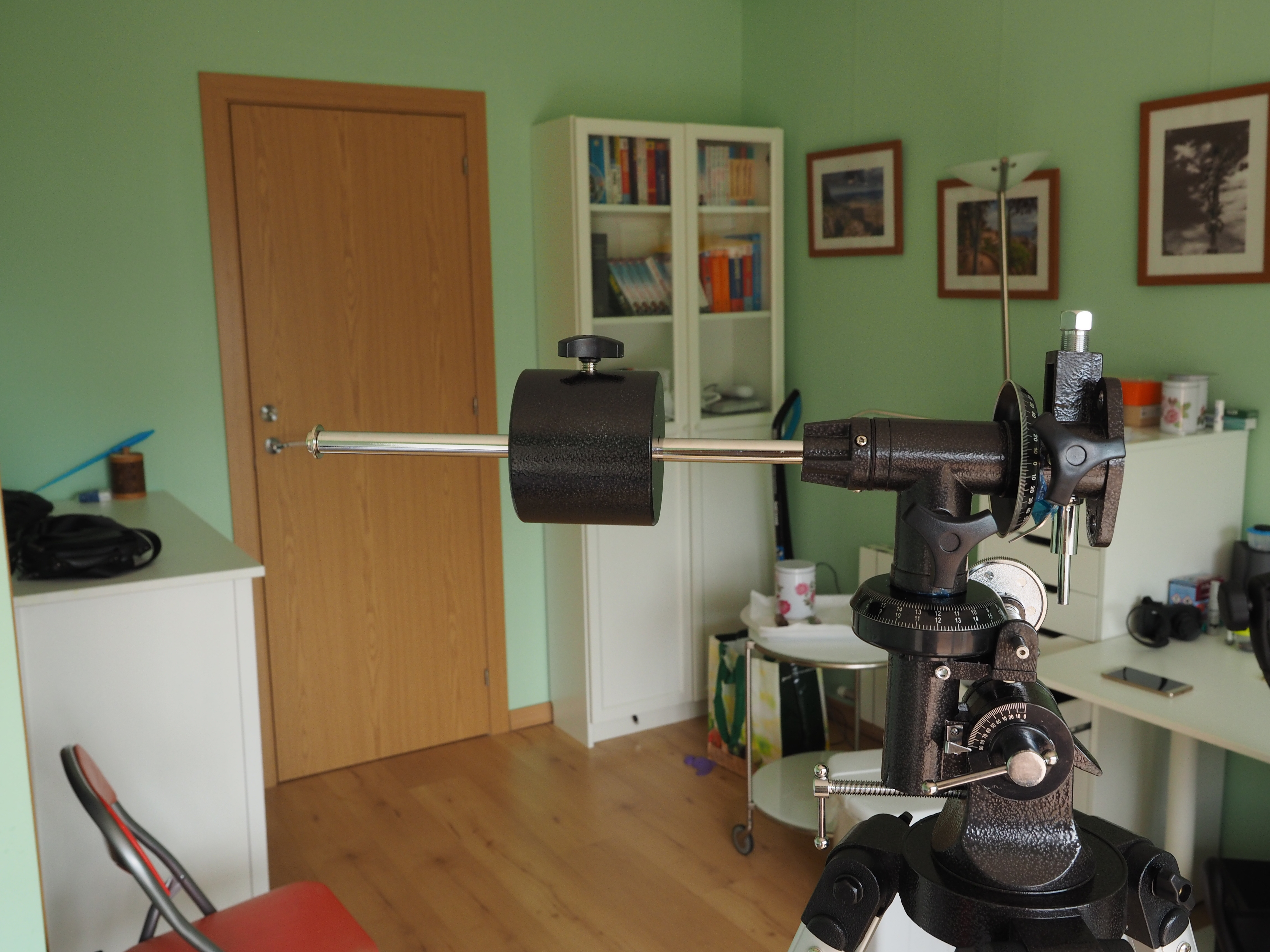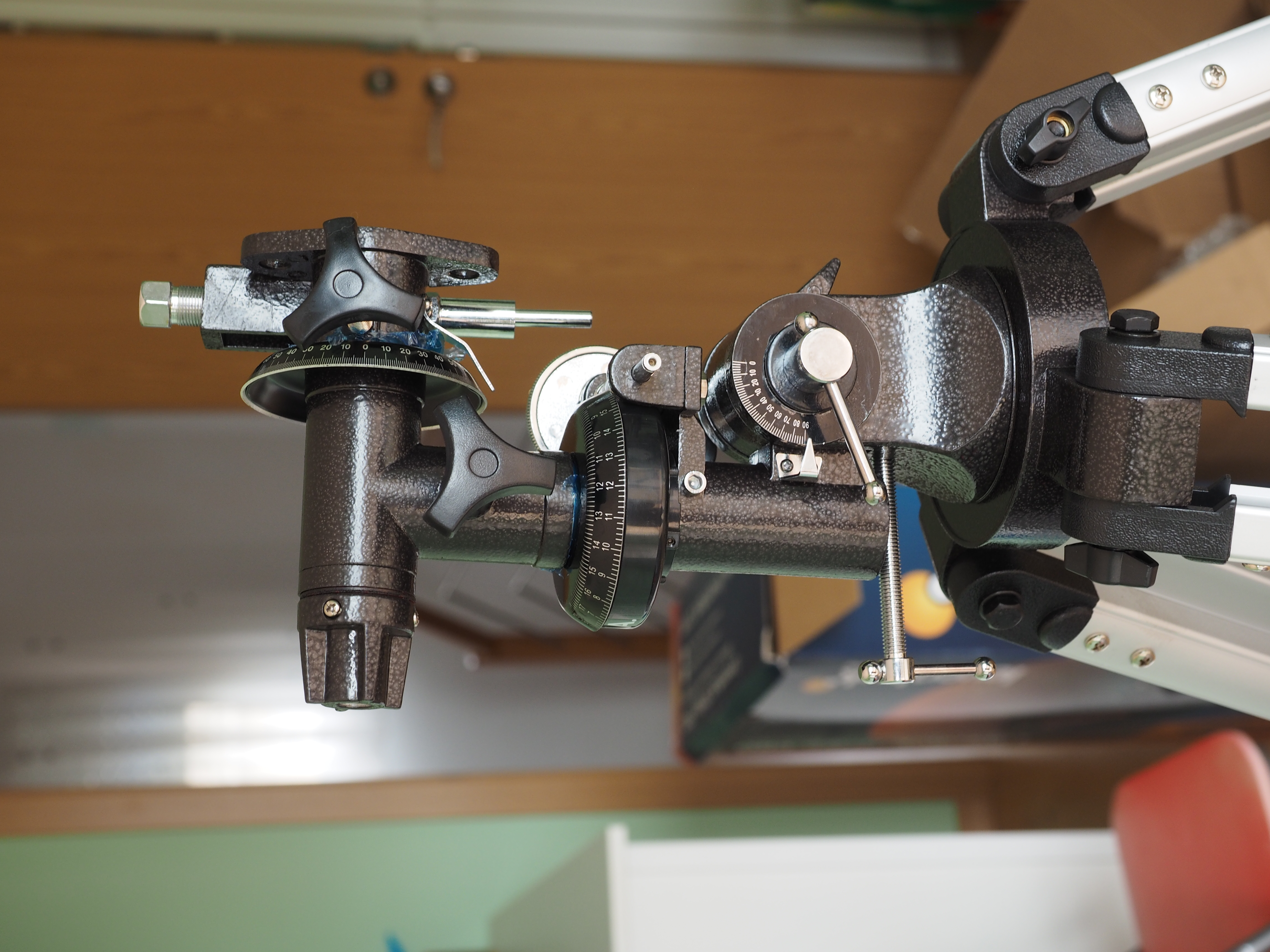 Монтировка снабжена двумя координатными кругами (видны на фото), которые облегчают поиск объектов на небосклоне по координатам из атласа. Эти круги установлены на ось склонений и ось прямого восхождения.
