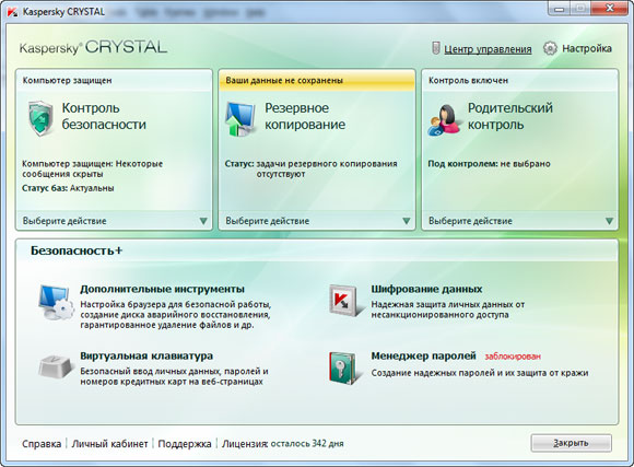 Kaspersky CRYSTAL - это практически тот же KIS, в который добавили еще несколько модулей, относящихся к защите системы. Модули следующие: менеджер паролей, резервное копирование, шифрование данных, централизованное управление защитой сразу нескольких компьютеров домашней сети (что для меня весьма актуально, так как в домашней сети - пять машин).
