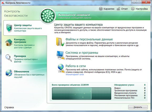 С месяц поизучал новый продукт от "Лаборатории Касперского" - Kaspersky CRYSTAL. Я вообще очень давно в качестве средства защиты компьютера использую их продукцию. Был период, когда какая-то из версий (вроде четвертая) мне не нравилась серьезной загрузкой системы и некоторыми глюками, так что я пересел под Nod32, однако с пятой версии снова вернулся на KAV, а уж когда появился Kaspersky Internet Security, который представлял собой целый защитный комплекс, включавший кроме антивируса еще и файрвол плюс много чего еще, я только KIS и использовал. Ну и на почтовом сервере Exler.ru у меня уже несколько лет отлично пашут специальные серверные версии антивируса и антиспама Касперского, которыми я очень доволен.