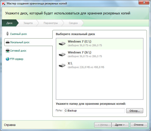 Хранилище может создаваться на съемном диске, физическом, сетевом или FTP.