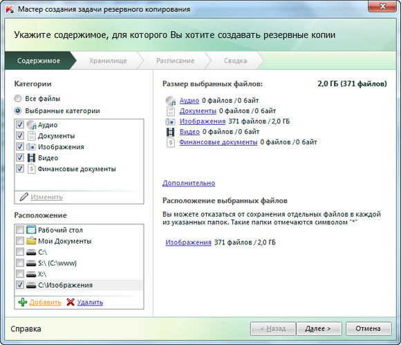 Отбор данных для хранения делается очень гибко: по расположению, по категориям, конкретные папки, фильтрация ненужных файлов.