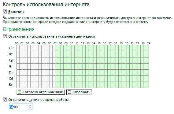 1. Контроль использования Интернета - устанавливать ограничения по часам, дням недели.
