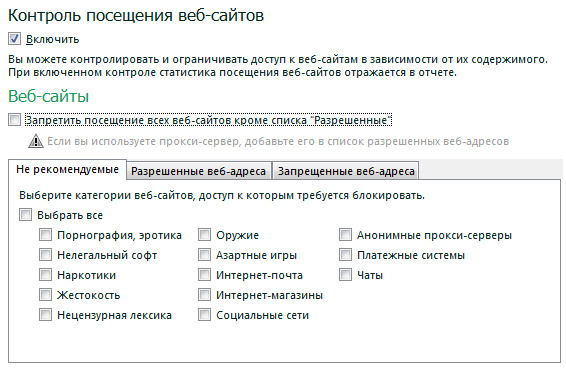 2. Контроль посещения веб-сайтов. Исключать определенные категории (это не особенно эффективно, хотя более или менее работает), задавать список разрешенных и/или запрещенных сайтов.