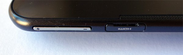 Левый торец - качелька регулировки громкости и выход microHDMI.