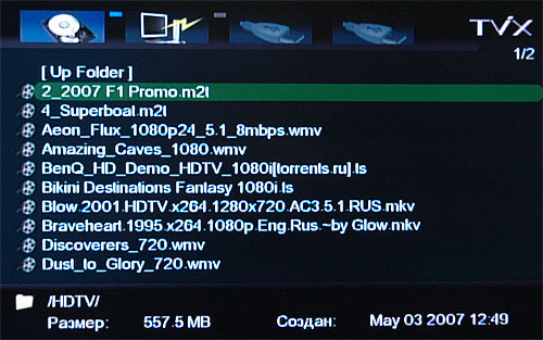 Причем все пункты, кроме Setup, выводят на обычный список папок и файлов. В чем разница - сразу разобраться непросто, однако потом выяснилось, что это меню будет нормально работать только при использовании специальных имен папок. То есть если вы назовете папки Video, Audio, Photo, HDTV и накидаете туда соответствующие файлы - тогда эти пункты меню будут открывать каждый свою папку. В противном случае - просто корневую папку диска устройства.