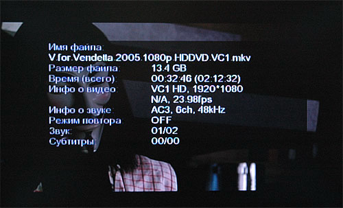Ну и дальше началось оно - ТЕСТИРОВАНИЕ. На диск были закачаны самые разнообразные видеофайлы - от обычных DVD (MPEG-2) и MPEG-4 (DivX, XviD) до High Definition во всевозможных видах: MPEG-2, MPEG-4, кодеки XviD, DivX, H.264, VC-1, WMV9, контейнеры AVI, MKV, TS, M2L и так далее - все, что я мог найти. Включая даже файлы, которые на компьютере-то воспроизводились только после танцев с бубном.
