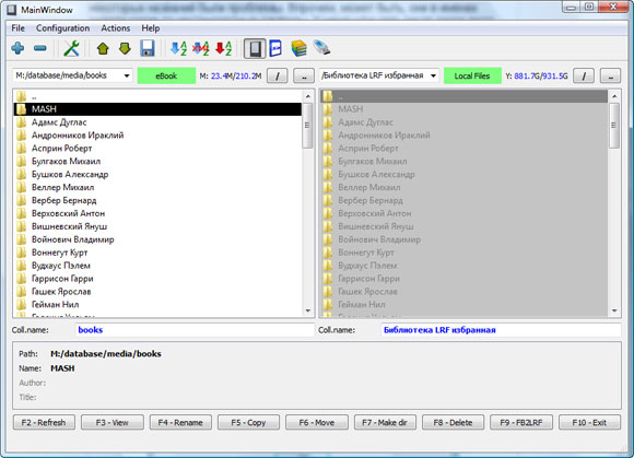 Теперь вы можете работать с файлами и папками - например, скопировать во внутреннюю память ридера заранее подготовленную коллекцию. Если подготовленные файлы в формате FB2, то вы можете одной кнопкой конвертировать эти файлы в LRF - в настройках программы есть специальный раздел, где прописываются пути к конвертеру и задаются соответствующие настройки.