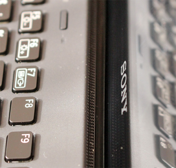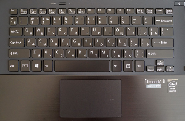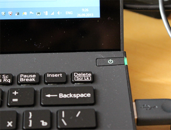 Из индикаторов тут присутствует только один, расположенный справа от клавиши питания. Присутствует он там, вероятно, просто для красоты, потому что дублирует цвет значка питания, который также является индикатором (на фото не видно, но значок также горит зеленым). Индикатор имеет только два цвета: зеленый - ультрабук включен, мигающий оранжевый - он в режиме сна. Индикация питания от батареи или зарядки батареи - не производится. Ну, вероятно, на склад Sony просто не завезли никаких других светодиодов, кроме зеленого и оранжевого.