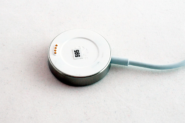 Крэдл тут сделан, на мой взгляд, достаточно неудачно. Он круглый, без бортиков, с магнитом и торчащими контактами. По идее, при посадке часов на этот крэдл материнские контакты корпуса часов должны найти маскулинно торчащие контакты крэдла и слиться с ними в экстазе. Но на практике это происходит нечасто: нужно очень внимательно смотреть, чтобы контакты нашли друг друга (бортиков-то никаких нет) и часы начали заряжаться.