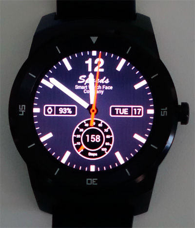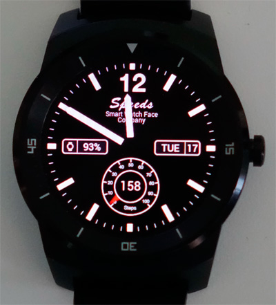 Ну и мой любимый скин (платный, сколько-то там центов) - Speeds Pro. Красивый циферблат, день недели, месяц, уровень заряда аккумулятора часов, количество пройденных шагов - то, что мне нужно!