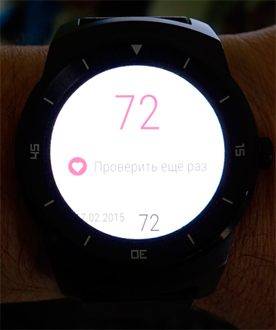 В отличие от LG G Watch здесь есть датчик измерения пульса. Правда, нормально он работает только в обычном состоянии: если, например, рука покрыта потом (при беге или быстрой прогулке) датчик будет показывать полную ерунду. Так что оно более для проформы, при занятиях спортом его использовать не получится.