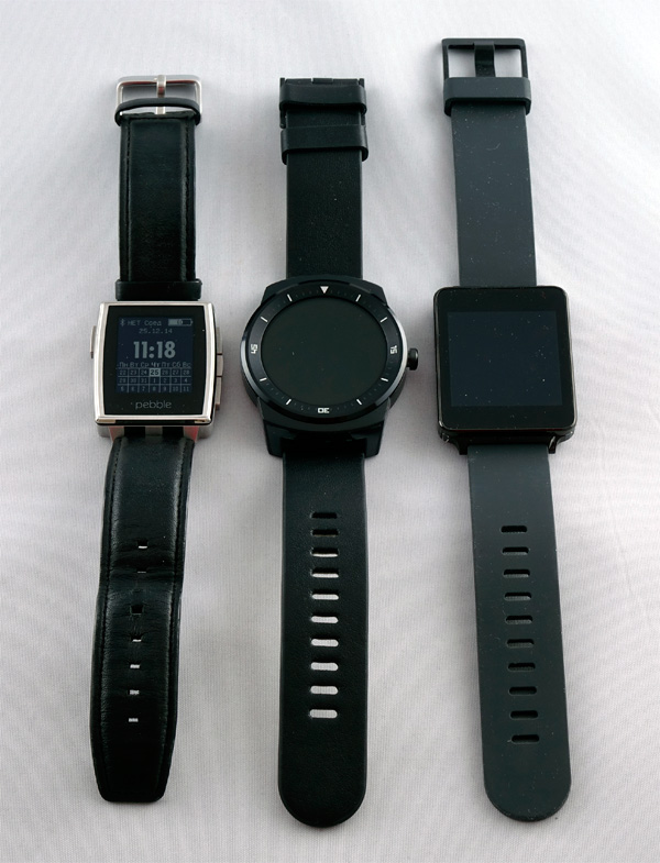 Заметьте, насколько LG G Watch R лучше смотрится в сравнении с явно гиковскими LG G Watch (совсем убогий дизайн) и Pebble Steel (дизайн слегка получше, но тоже, скажем прямо, хорошее впечатление не производит).
