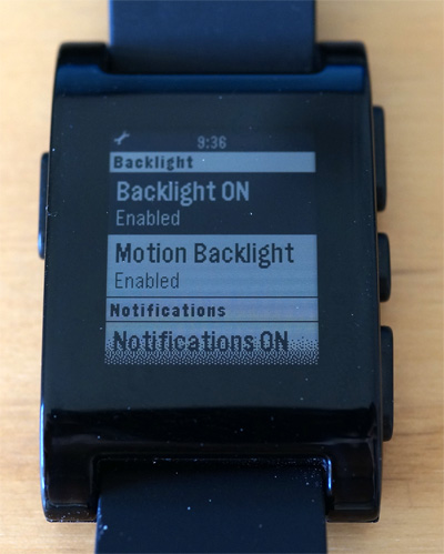 Дисплей у Pebble сделан исключительно удачно. Это технология ePaper производства компании Sharp - цитирую производителя: черно-белый LCD-дисплей с ультра-малым потреблением энергии. Часы отлично выглядят при плохом освещении, прекрасно выглядят на ярком солнце (цветные ЖК-дисплеи на ярком солнце сильно "слепнут") плюс имеют подсветку, которая может активироваться движением - достаточно просто встряхнуть рукой.