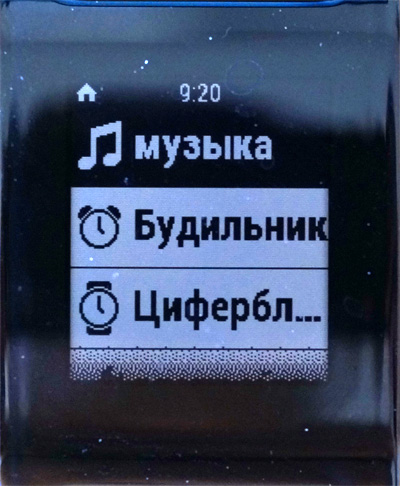 Меню часов: музыка, установка будильника, смена скина, настройки.