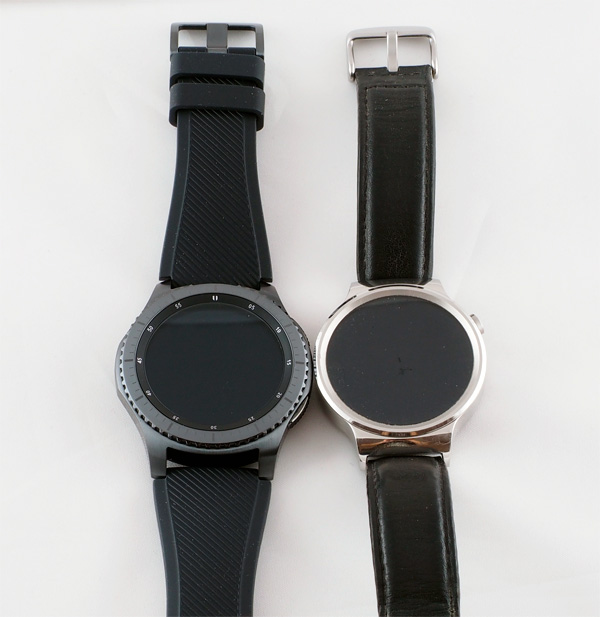 Ну и вот Gear S3 рядом с Huawei Watch. На мой взгляд, Gear S3 смотрятся заметно более эффектно.