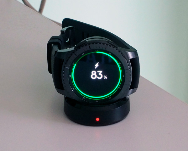 При подключении встроенной в часы системы определения координат (она используется при отслеживании активности, а также может записать трек перемещений, который потом открывается из приложения Samsung Gear на смартфоне в Google Maps) она дополнительно расходует где-то 12-15% заряда в сутки при хорошей активности - в данном случае имеется в виду быстрая прогулка на 15 километров.