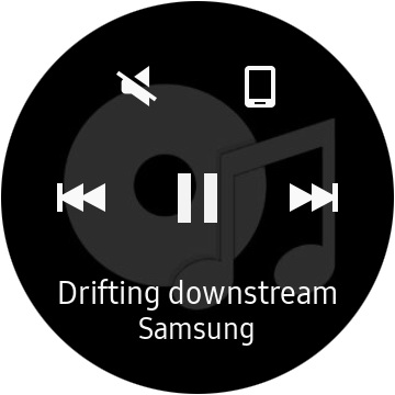 Медиаплеер. Умеет воспроизводить аудиотреки как со смартфона, так и с самих часов (пиктограмма справа сверху переключает источник треков). С самих часов очень грамотно воспроизводит (не то что в Android Wear). Показывает список треков, позволяет создавать списки воспроизведения, сортировать по альбомам и исполнителям. Закачиваются композиции в часы со смартфона из приложения Samsung Gear по беспроводной связи.