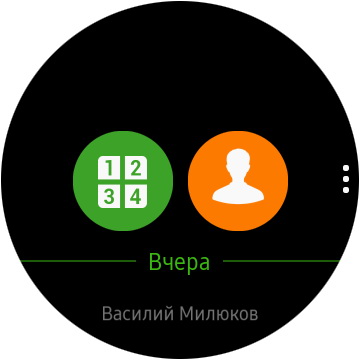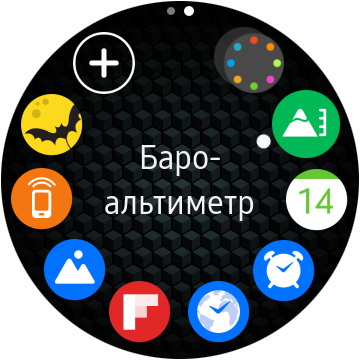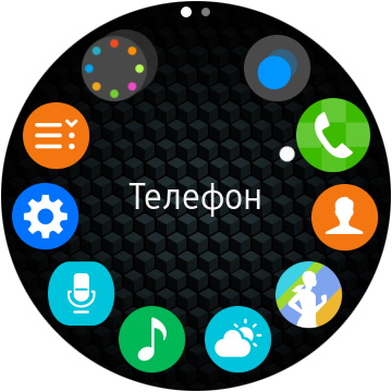 Поворот колеса по часовой стрелке - виджеты различных приложений. Тап по виджету - вызов расширенной информации и, возможно, пиктограмм различных действий (как, например, в телефонном приложении).