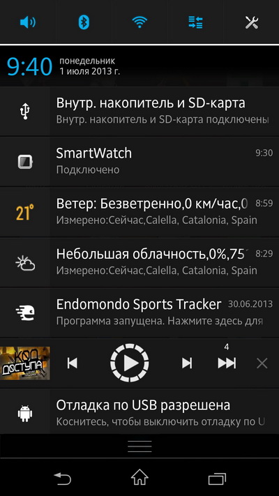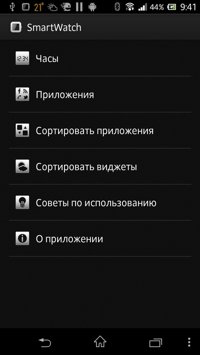 После подключения, по идее, надо запустить приложение SmartWatch. Однако оно, как ни странно, в списке приложений не обнаруживается, а появляется только в области уведомлений, когда часы подключены.