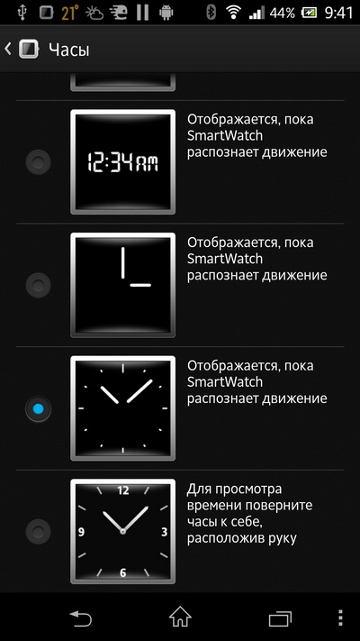 Основной режим - показ времени. Вариантов, как я говорил, до странности немного. Ну и единственный практически доступный режим - экономичный, когда время включается кнопкой. Можно также включать часы постукиванием по экрану, но тогда вам придется изображать из себя дятла и долбить, пока эта тварь не соизволит включиться. Серьезно, достает страшно.