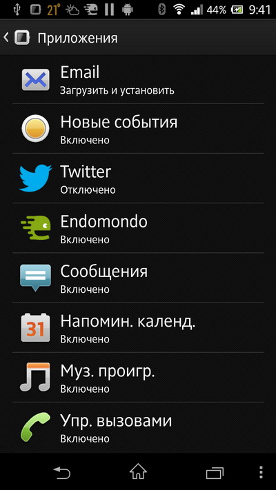 Следующий пункт - приложения. Подразумевается, что главная прелесть данных часов - всевозможные приложения, которые отражают данные с подключенного смартфона. Приложения тут вполне ожидаемые: погода, твиттер, Facebook, сообщения, почта, календарь, плеер, телефон и так далее.