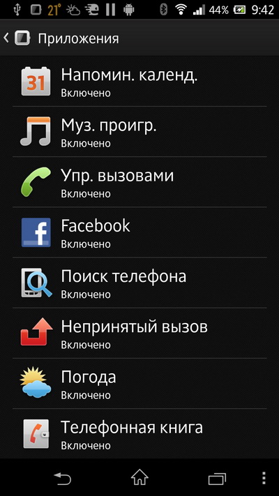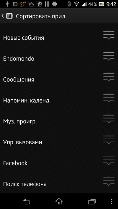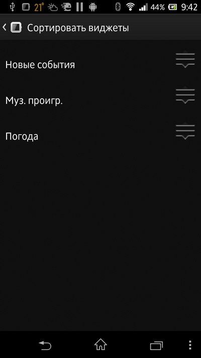 Также тут есть виджеты, но их всего три - события в Facebook/Twitter, проигрыватель и погода. Вы также можете менять их порядок.
