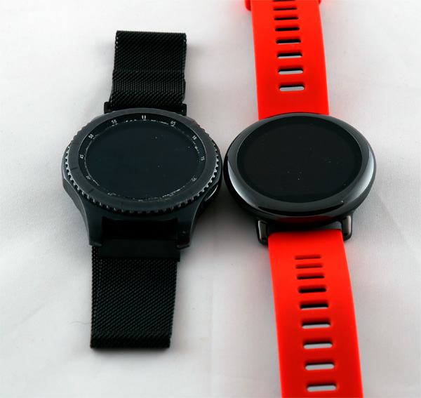 Вот эти часы рядом с Samsung Gear S3 frontier, которые, конечно, выглядят намного интереснее. (Хотя у них красочка слегка пообсыпалась за год использования, что внешний вид, конечно, портит.)