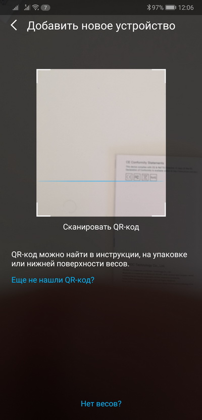 Подключение весов производится элементарно: нужно просканировать QR-код, расположенный на коробке, или в инструкции, или на нижней поверхности весов.