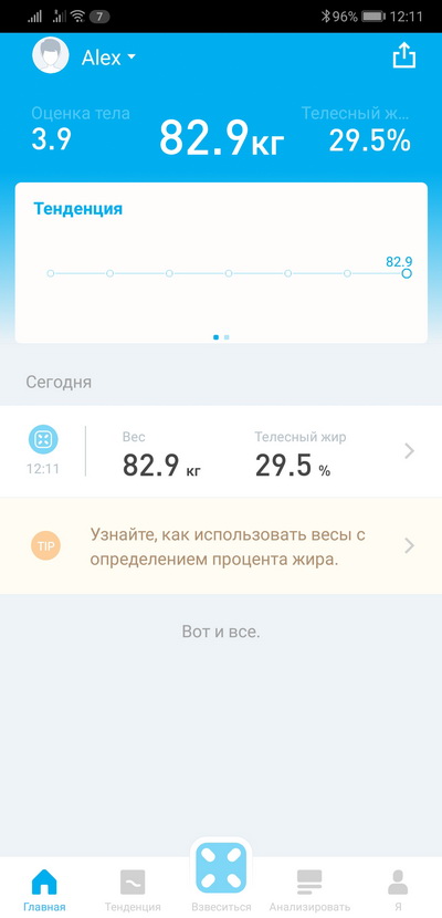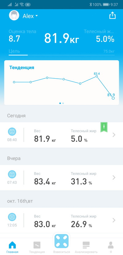 С моделью Picooc Mini все работало точно так же, за исключением того, что перед взвешиванием требовалось открыть приложение и нажать кнопку "Взвеситься" - чтобы данные попали в приложение и в облако.