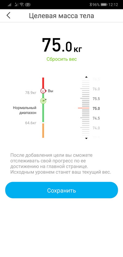 Весы следят за изменениями параметров и сообщают, когда тот или иной параметр достиг нормы. У меня объем влаги в теле достиг стандарта - за это надо немедленно увлажниться!