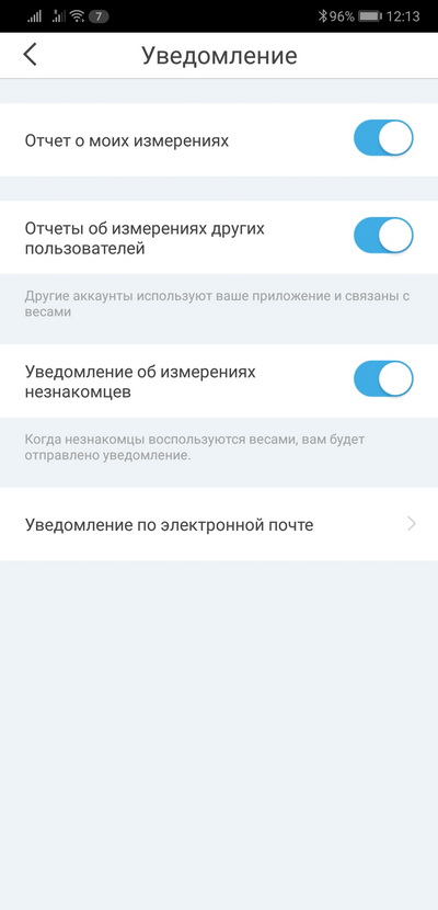 Настройка уведомлений. "Уведомления об измерениях незнакомцев" мне особенно понравились. Приходишь домой, а весы тебе заявляют: "Слушай, тут без тебя какой-то незнакомец взвешивался!"