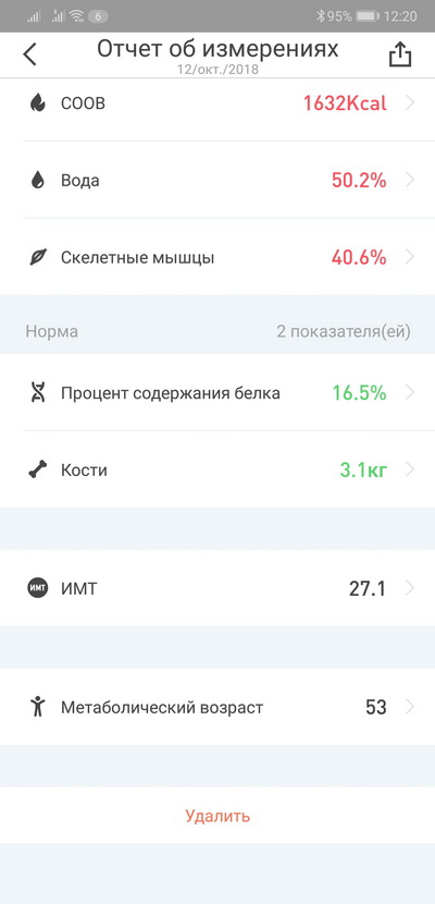 Метаболический возраст определил почти один в один, что, кстати, неудивительно, потому что в профиле в обязательном порядке заставили указать год рождения. Но, кстати, за такие деньги могли бы для метаболического возраста скидывать десяток лет - просто чтобы порадовать покупателей.