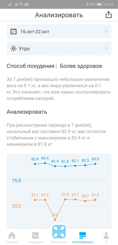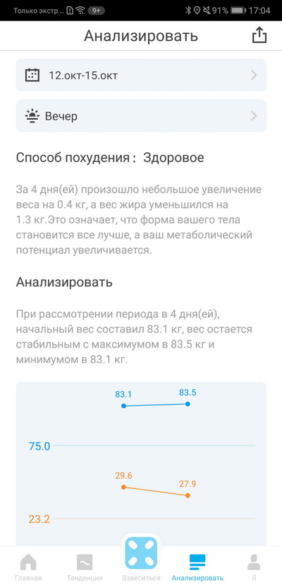 С моделью Picooc S3 все работало как часы. В смысле, как весы. Только надо было не забывать взвешиваться, вставая на весы голыми ногами без носков, иначе некоторые параметры неправильно определялись. На смартфон и в облако все передавалось, по графикам можно было отслеживать и изменение веса, и изменения остальных параметров.