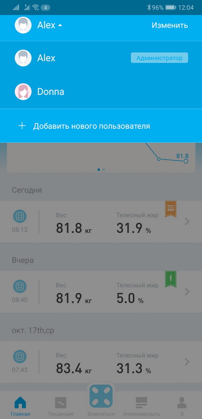 При каждом измерении показываются все параметры и отмечается, насколько они отличаются от нормы. Замечу, что для получения этих данных используется метод биоимпеданса: через тело пользователя пропускается небольшой ток. За счет него за 3-4 секунды измеряется 12 биометрических параметров: вес, общий процент жировых тканей, индекс висцерального жира, содержание белка, базальный метаболизм (основной обмен веществ), мышечная масса, костная масса, процент воды, ИМТ, тип тела, возраст тела, масса скелетных мышц.