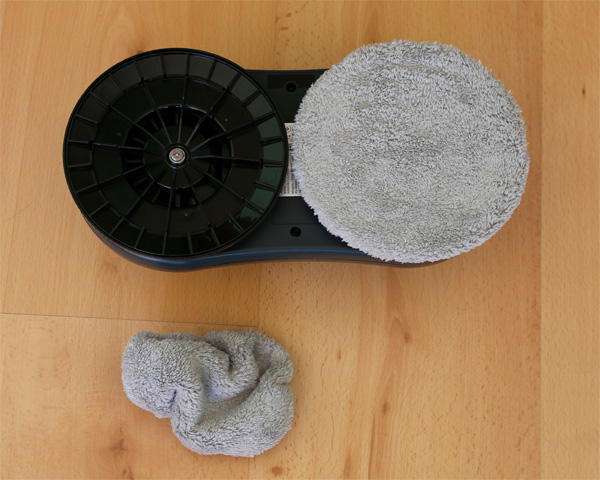 На нижней поверхности - две круглые вращающиеся головки, на которые надеваются съемные мопы из микрофибры.