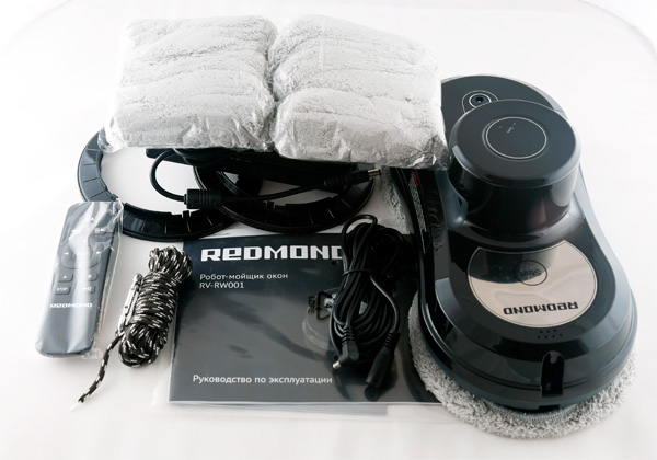 Внутри: робот-стеклоочиститель, адаптер питания с удлинительным кабелем, запасные мопы (насадки из микрофибры) - 8 штук, съемные кольца для мопов, страховочный шнур с карабином, пульт управления с аккумулятором, руководство по эксплуатации, сервисная книжка.