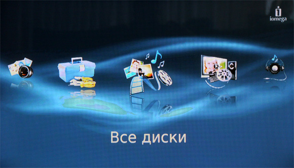 Так как никакие сетевые (в плане локальных сетей) и интернет-сервисы здесь не предусмотрены, пиктограмм совсем немного: все диски (это любое медиасодержимое), фото, аудио, видео и настройки. Вот и все.