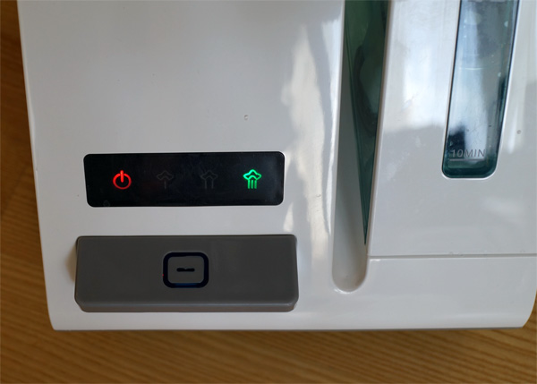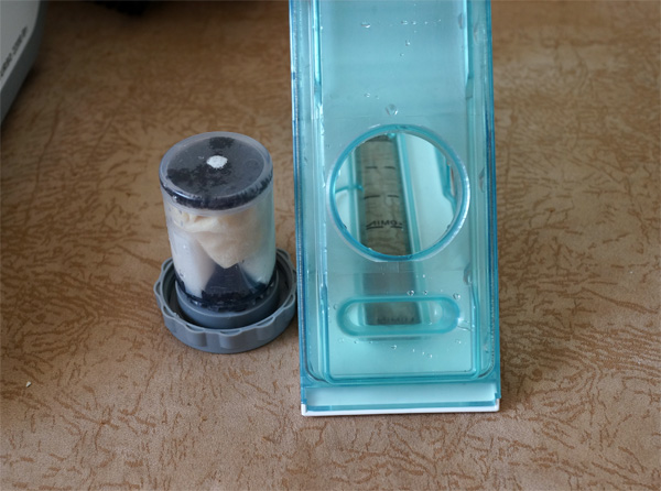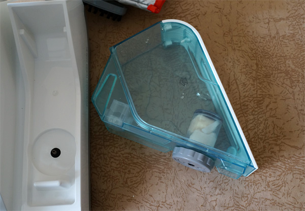 Емкость для воды легко вытаскивается из корпуса отпаривателя. Принцип здесь такой же, как у пассивных увлажнителей воздуха: из емкости вывинчивается специальная пробка с фильтром, в емкость заливается вода, крышка закручивается и емкость просто вставляется в гнездо корпуса - вода будет поступать через клапан крышки.