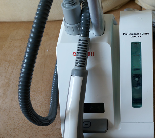 Включение отпаривателя производится ногой - нужно нажать на специальную кнопку. Этой же кнопкой выбирается нужный режим: здесь предусмотрено три вида подачи пара. Первый режим - самый мягкий, он предназначен для деликатных тканей, вроде шелка. Второй режим предназначен для обработки большинства тканей. Третий, самый мощный, используется с толстыми грубыми тканями.
