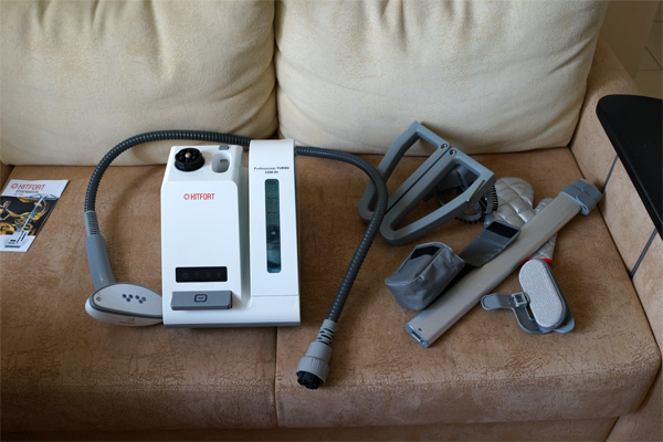 В комплект входят: корпус отпаривателя с емкостью для воды, ручка со шлангом и утюжком, телескопическая стойка с вешалкой, сумочка для насадок, насадка для проглаживания стрелок, две ворсовых насадки-щетки, щетка с микрофиброй, защитная варежка и инструкция к применению.