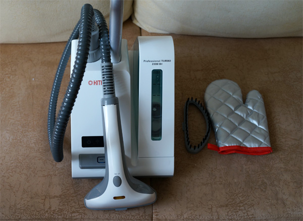 Теперь по поводу опасности обжечься: все-таки из утюжка идет достаточно мощная струя пара. Тут, конечно, нужно просто быть внимательным и не подносить незащищенную руку под струю. Лучше всего - использовать входящую в комплект специальную защитную рукавицу, которая позволяет подносить вторую руку очень близко к утюжку отпаривателя. Однако при определенной сноровке можно обходиться и без нее - только проявлять при этом осторожность.