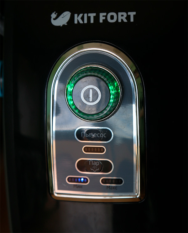 Панель управления - очень простая. Кнопка включения-выключения с индикацией, включение-выключение пылесоса, включение-выключение подачи пара и два вида регулировки пара: минимальный и максимальный. Минимальный используется для деликатных поверхностей - ламинат, паркет, максимальный - для плитки.