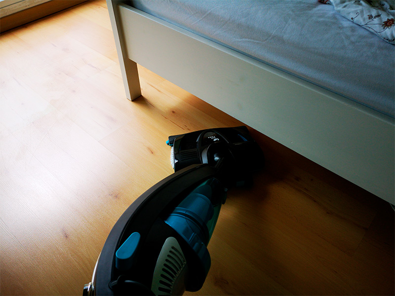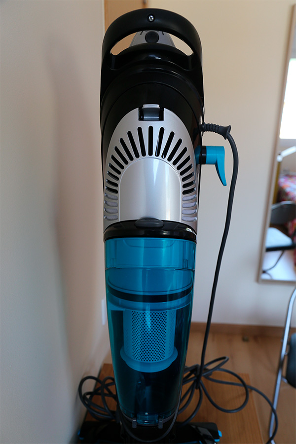 Еще важный момент: шарнирный механизм крепления  пылесоса к нижней части хорошо продуман. В вертикальном положении пылесос четко фиксируется и стоит вполне устойчиво, во время обработки его можно повернуть в сторону и ориентировать пылесос почти горизонтально - это позволяет спокойно пылесосить под кроватью, что очень даже актуально.