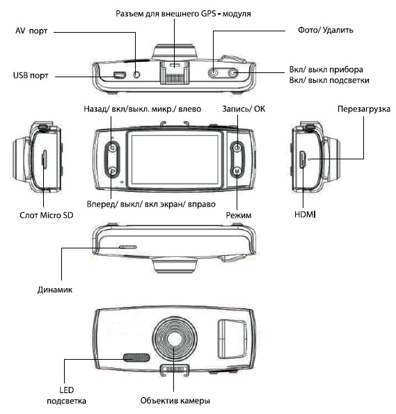 В комплект входят: видеорегистратор, автомобильный адаптер, USB-AV-кабель, кронштейн для крепления к стеклу, инструкция.