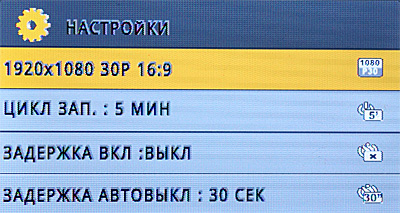 Первый пункт - режим записи. Там три варианта: 1920x1080p 30 к/с, 1280x720p 60 к/с, 1280x720p 30 к/с.