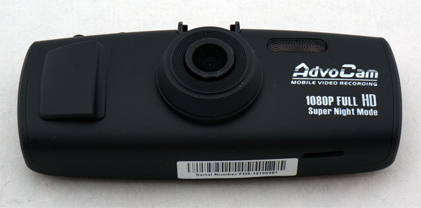 На лицевой части располагаются объектив, лампа LED-подсветки, пластиковый выступ, помогающий держать корпус регистратора в руке.
