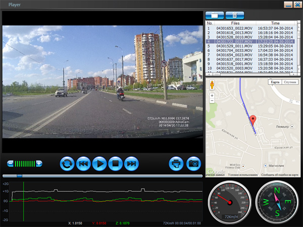 В каждом ролике фиксируются координаты GPS, направление, скорость движения и срабатывания G-сенсора. Все это можно увидеть, если открыть ролик в специальном плеере, который записан на приложенном диске с ПО. (Кликабельно.)