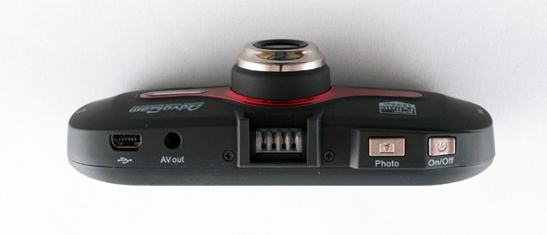 На верхнем торце - выход miniUSB, выход AV, посадочное гнездо с контактами, кнопки "Фото" и включение/выключение.