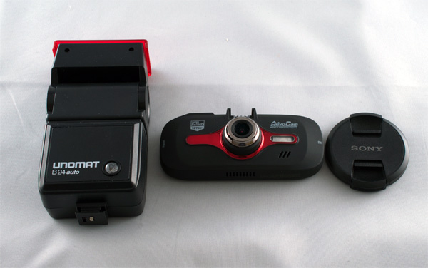 Вот фото устройства рядом с небольшой вспышкой и крышкой объектива фотоаппарата - просто для сравнения масштабов.