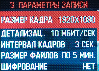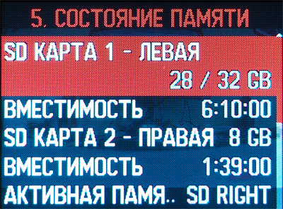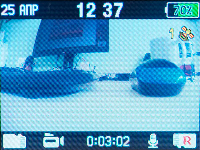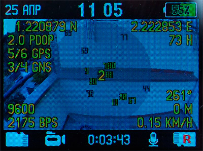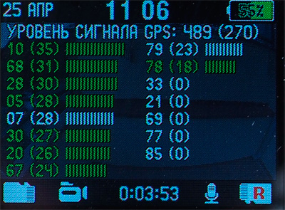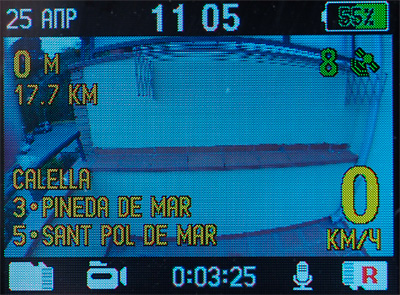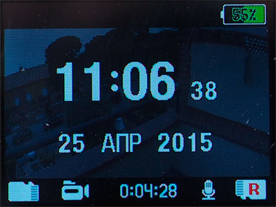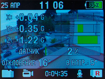 Интерфейс видеорегистратора - продуманный и удобный. (Замечу, что весь программный интерфейс в данном случае не русифицированный, а изначально написанный сотрудниками компании "Датакам" на русском языке - они это особо подчеркивают.) По умолчанию на дисплей выводится самое необходимое: дата, время, уровень заряда батареи, количество спутников, на какую карту памяти ведется запись, вид съемки, работа микрофона, время записи ролика.